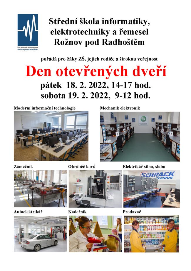 18. a 19. 2. 2022 pořádáme pro žáky ZŠ, jejich rodiče a širokou veřejnost Den otevřených dveří.