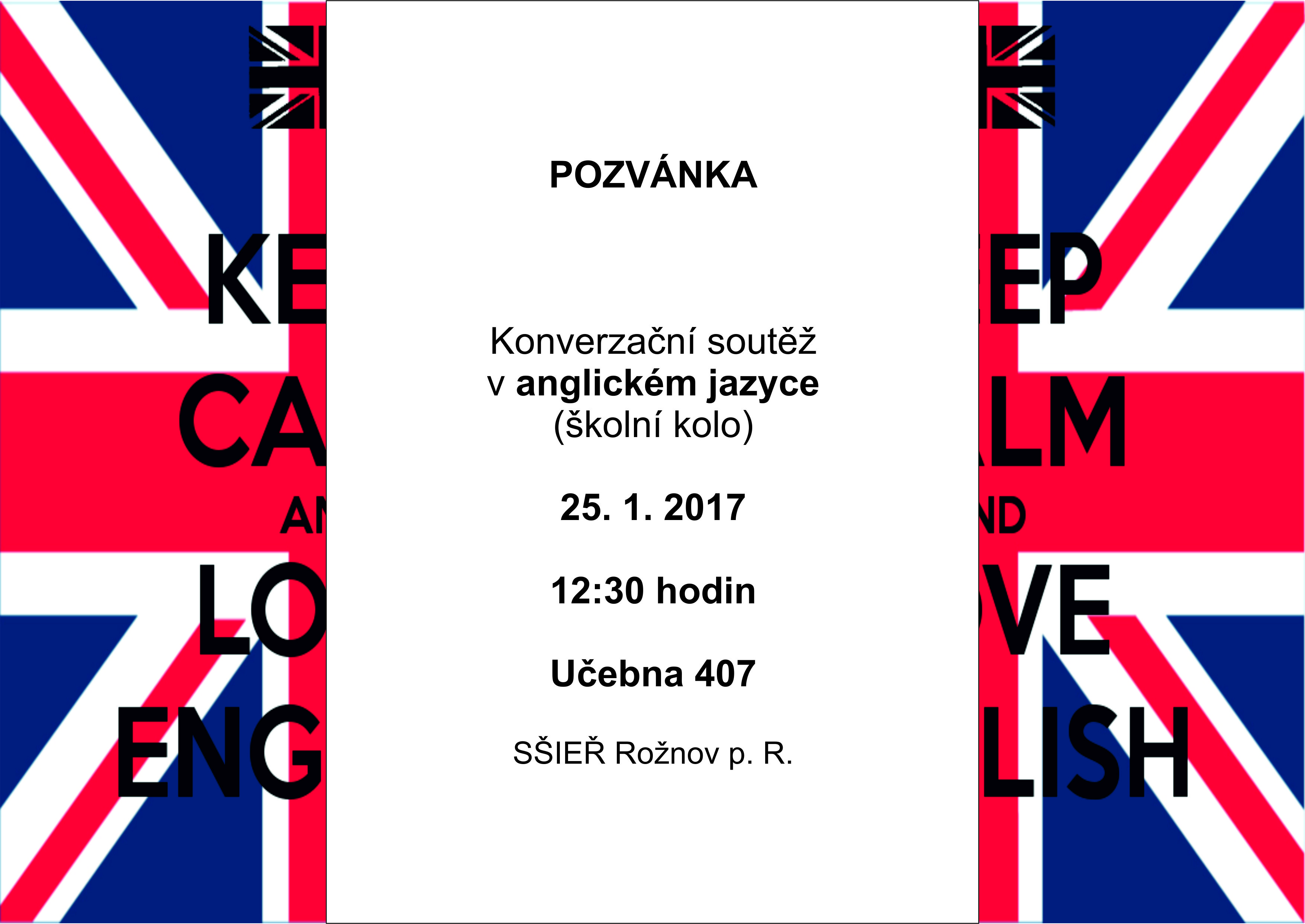 Zveme Vás na konverzační soutěž v anglickém jazyce, která se uskuteční dne 25. 1. 2017 ve 12:30 hodin v učebně 407.