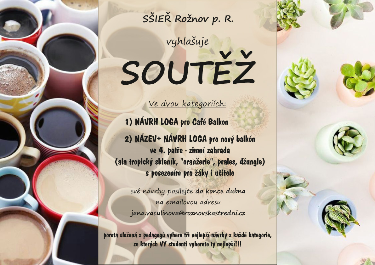Vyhlašujeme soutěž o nejlepší návrh loga pro Café Balkon ve 3. patře a zároveň také soutěž o název + logo pro vznikající nový balkón ve 4. patře.